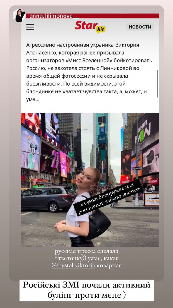 В частности, Апанасенко в Instagram опубликовала скриншот из одного из российских пропагандистских медиа. Там Викторию обвиняют в том, что она призвала бойкотировать страну-террориста Россию и вроде бы "не скрывала брезгливости" в отношении россиянки Анны Линниковой.