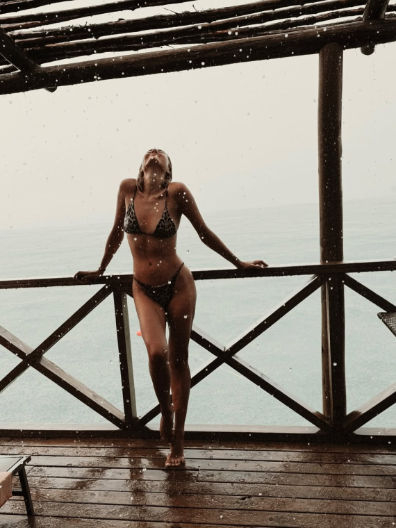 В своем Instagram звезда опубликовала кадры, где позировала под дождем в купальнике с хищным принтом.