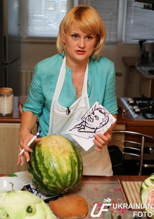 Михайлова перенесла с помощью трафарета лицо Януковича на арбуз, а затем прошлась по его контурам тоненьким ножиком.