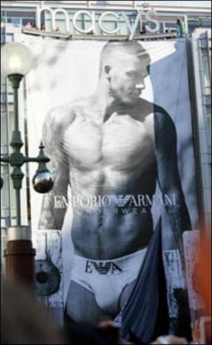 Для участия в рекламной кампании Emporio Armani Дэвид спрятал все свои достоинства в трусы, которые кажутся слишком узкими для такого красавца. Поговаривают, что создание столь пикантных фотографий не обошлось без фотошопа. На других рекламных фотографиях 33-летний звезда футбольного клуба LA Galaxy позирует на пляже Малибу в Калифорнии.