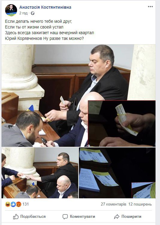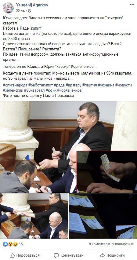 "Юзик" раздает билеты в сессионном зале парламента на "Вечерний квартал". Работа в Раде "кипит". Билетов целая пачка (на фото не все), цена одного иногда варьируется до 3500 гривен. Далее возникает логичный вопрос: "Что означает эта раздача? Блат? Взятка? Поощрение? Расплата?". Таким вопросом должны заняться антикоррупционные органы. Теперь он не "Юзик", а Юрик "кассир" Корявченков. Когда-то в ленте прочитал: "Можно вывести мальчиков из "Квартала 95", но "Квартал" из мальчиков - никогда", - говорится в заметке журналиста.