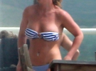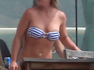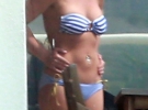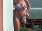 Поп-звезда была сфотографирована на пляже в Малибу в стильном маленьком бикини в бело-синюю полоску, обнажающем стройный подтянутый живот.