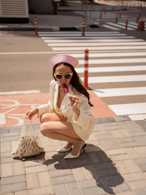 Аутфит дополнила солнцезащитными очками и плетеной сумкой. В руках держала мороженое.