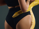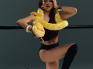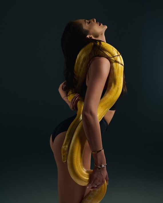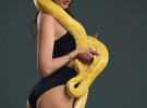 Вокруг тела обмоталась желтым питоном, а образ дополнила золотыми украшениями и длинными сапогами.