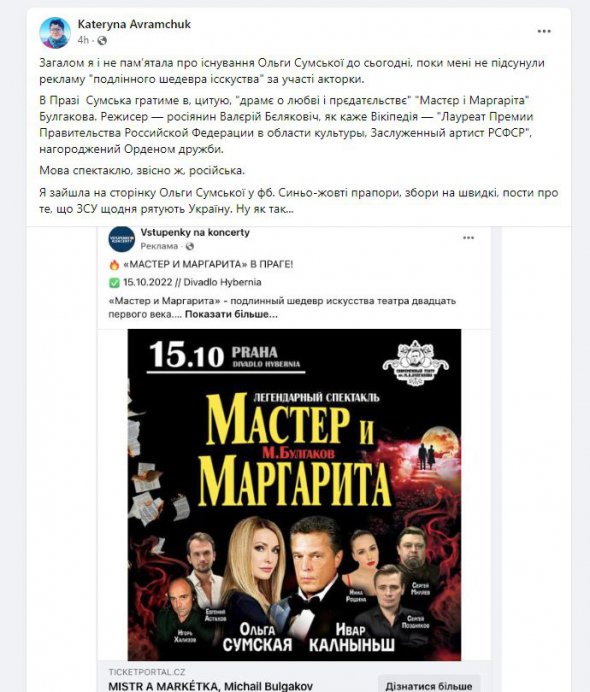 Актриса Ольга Сумская отреагировала на возмущение пользователей соцсетей из-за ее участия в спектакле "Мастер и Маргарита", который поставил российский режиссер Валерий Белякович.