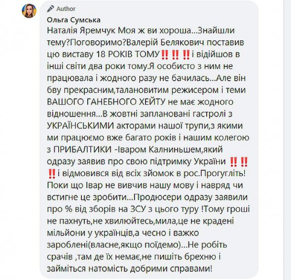 На своей странице в Facebook она заявила, что режиссер давно умер, и с ним она даже не была знакома. Сумская напомнила, что Белякович поставил этот спектакль 18 лет назад.