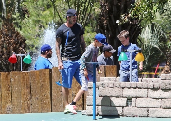 Дэвид Бекхэм наверняка скучает по спортивными буднями, недавно он провел небольшое соревнование по мини-гольфу с сыновьям. Круз и Ромео тщательно следил за игрой и пытались во что бы то ни стало выиграть, в то время, как их отец едва не потерял шорты.