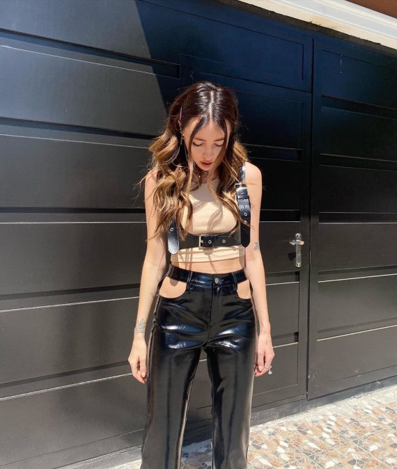 На фотографии звезда позирует в кожаных штанах, светло-коричневом топе и с портупеей.