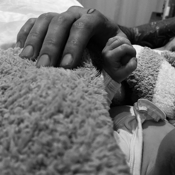 На первом снимке роженица не показала лицо дочери, а лишь ее маленькую руку, которую держит в своей.