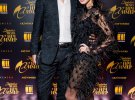Кухар пришла в прозрачном наряде черного цвета, украшенном кристаллами и перьями. Александр Стоянов выбрал темный костюм, пишет segodnya.ua.