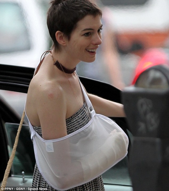 Накануне папарацци запечатлели 29-летнюю звезду в Нью-Йорке. Энн прогуливалась по Бруклину и заскочила в один из ресторанчиков пообедать с приятелями. Девушка выглядела довольно веселой и мило улыбалась, вот только повязка на правой руке несколько портила идиллическую картину.