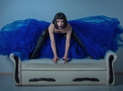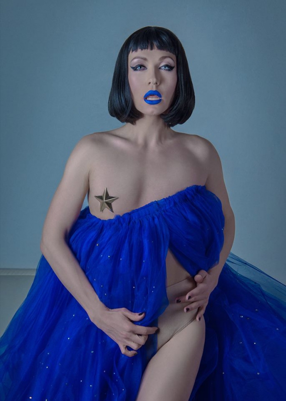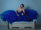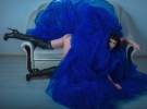 Для фотографий травести-дива подобрала черный парик и яркую синюю юбку из фатина.