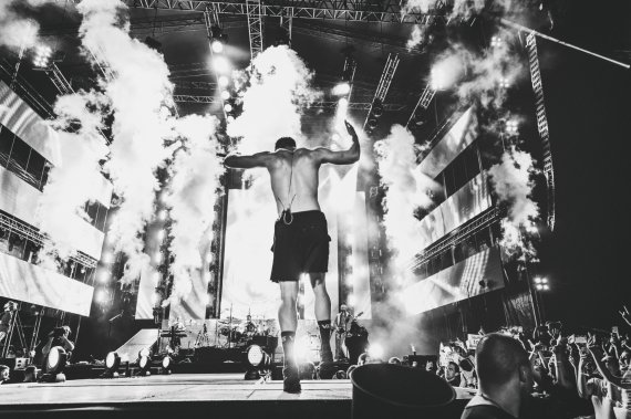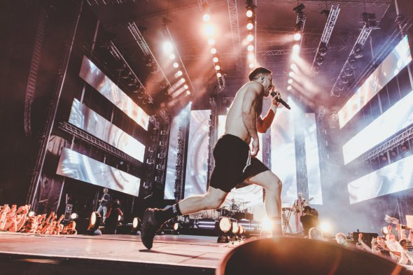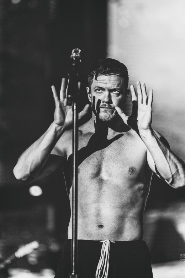Начали Imagine Dragons с легендарной "Radioactive", которая подняла настоящий фурор, а солист Дэн Рейнольдс в шортах и кроссовках раскачал публику с первых нот.