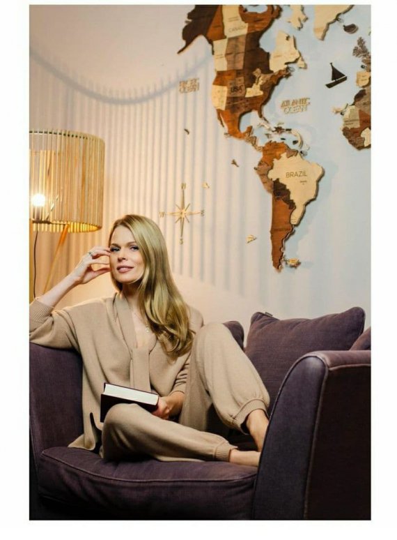 Интерьер в квартире выполнен с использованием натуральных материалов в светлых тонах. Недавно ведущая повесила на стену большое панно в виде деревянной карты.