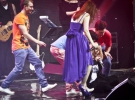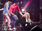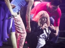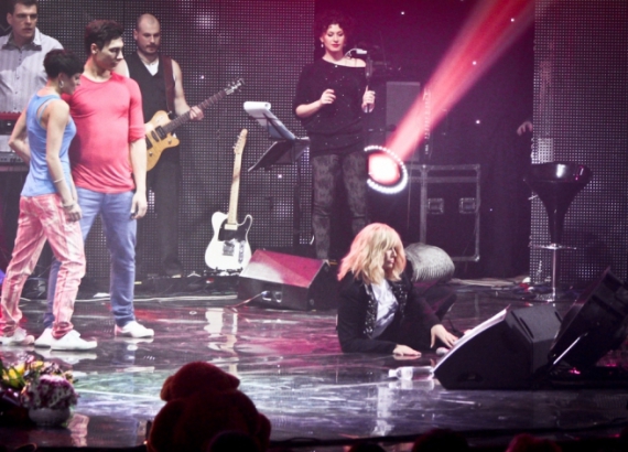 Певица поскользнулась и, не удержав равновесия, упала на пол.