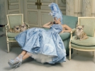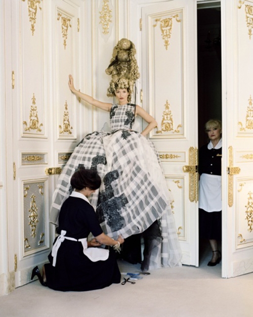 Наряды для съемок были подобраны сплошь кутюрные. А сопроводительная надпись гласит, что аристократичные одежды были подобраны для воссоздания образа Марии Антуанетты и ее знаменитого поместья Малый Трианон. Уточняется, что для создания роскошных туалетов потребовалось "12 000 часов ручного труда".
