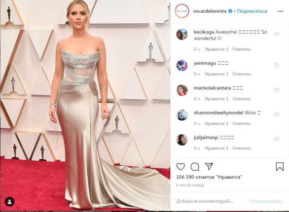 На красной дорожке "Оскара-2020" Скарлетт также появилась в платье от Oscar de la Renta, но немного другого фасона. Наряд выполнен в нежных жемчужных оттенках. На странице бренда отмечается, что корсет сшит и декорирован вручную. На создание наряда ушло более 300 ч. мастеров модного бренда.