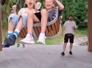 Парень улыбчиво катался на качелях. Девушка продемонстрировала отличную растяжку.