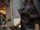 Для фотосессии выбрала светло-синие джинсы, белую футболку, клетчатую рубашку и кожаную куртку шоколадного оттенка. Образ дополнила собранными волосами, солнцезащитными очками, перчатками и ботфортами.