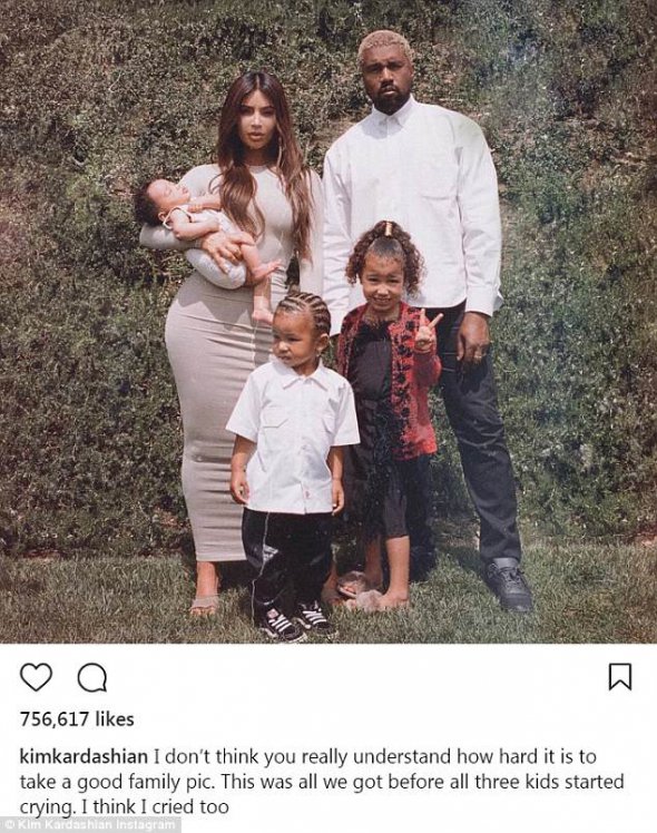"Не думаю, что вы действительно понимаете, как трудно сделать хороший семейный снимок. Вот что получилось, прежде чем наши дети заплакали. Кажется, я тоже плакала", - трогательно написала Ким Кардашьян.