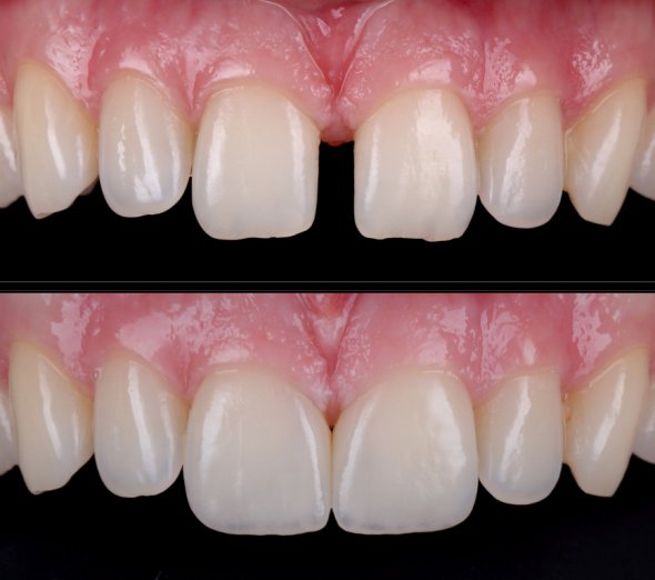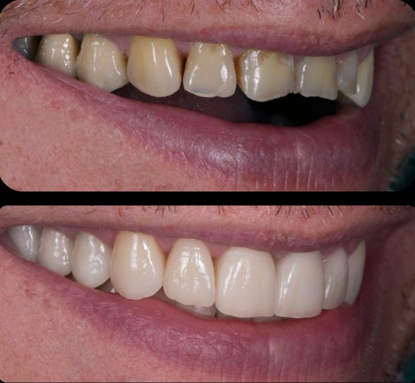 Четко видно, что два передних зуба не свои. Они разного цвета, к тому же имеют темные полоски у десен. Это значит, что десна сместились вверх. Надо пролечить зуб и сделать две керамические коронки естественного цвета.