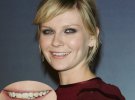 У Данст очень высокое положение губы, глаза "цепляется" не только за зубы и десна. У нее два выхода: подкорректировать положение верхней губы, чтобы она не поднималась так высоко во время улыбки. Расстояние между верхней и нижней губой заполнить светлыми зубами.