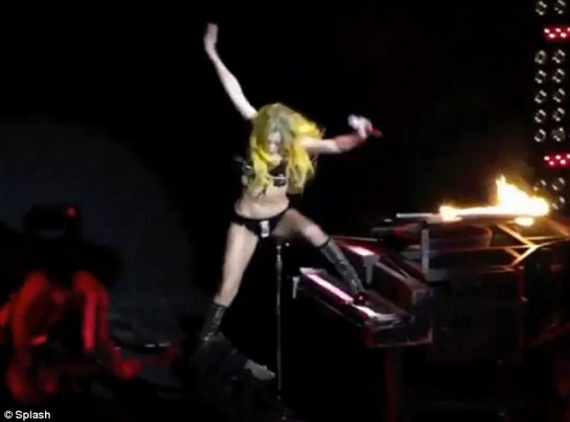 Во время шоу артистка, как обычно, залезла на пианино в одном нижнем белье и в сапогах на шпильках. Спев первый куплет, певица собралась слезть с музыкального инструмента, но стул, на который она поставила ногу, внезапно упал. Потеряв равновесие, артистка рухнула под пианино, со всей силы ударившись спиной и головой. Однако сильный ушиб не заставил Гагу прекратить пение. Сделав вид, что ничего не произошло, она с трудом встала и продолжала выступление.