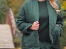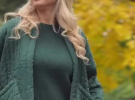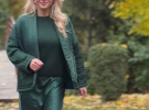 Перед камерой предстала в свитере, атласной юбке и куртке изумрудного цвета. Образ дополнила распущенными волосами, легким макияжем и сапогами.
