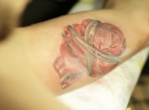 "Набивали четыре часа. Поскольку на внутренней стороне бицепса кожа очень тонкая, то было больно, особенно, когда делали контуры. Потому что кожа там прокалывается глубже. В принципе, для тех, кто настроен на татуировку - ничего страшного нет. Труднее на самом деле несколько часов высидеть в кресле", - рассказал певец Gazeta.ua.