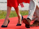 Супруги шли по красной дорожке с самолета, когда фотографы заметили, что на платье Меган до сих пор весит ценник из магазина. Кстати, пурпурный наряд герцогини от марки Self Portrait стоимостью $ 444, дополнила клатчем Christian Dior Clutch и туфлями Manolo Blahnik BB.