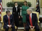 Мелания подобрала наряд изумрудного оттенка, который подчеркивал все достоинства фигуры первой леди. Супруга Дональда старалась вести себя непринужденно, много улыбалась и общалась с королевой Ранией.