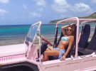 На последних снимках модель позирует в голубом купальнике на фоне океана, сидя на капоте розового автомобиля. Прадо дополнила нежный образ голубым парео и солнцезащитными очками.
