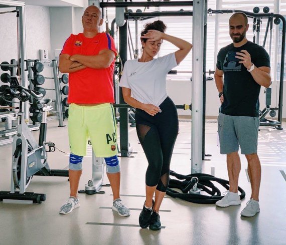 Супруги начали своё утро со спортзала. Они всё делают вместе, даже тренируются.