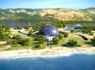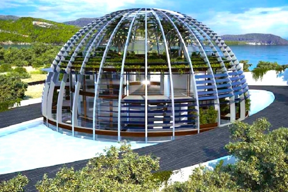 Многоуровневый центральный купол дома, покоящийся на стальном каркасе, представляет собой идеальную полусферу. Под куполом расположена просторная ландшафтная терраса с панорамными видами. Стены и потолок выполнены из стеклянных панелей. Для защиты от палящего зноя в жаркое время года используются встроенные наклонные жалюзи и дополнительные "отдушины" для эффективной приточной вентиляции.