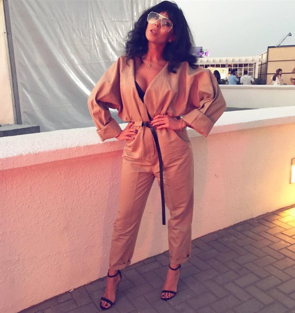 Комбинезон с поясом дополнила объемной укладкой, черными босоножками и солнцезащитными очками.