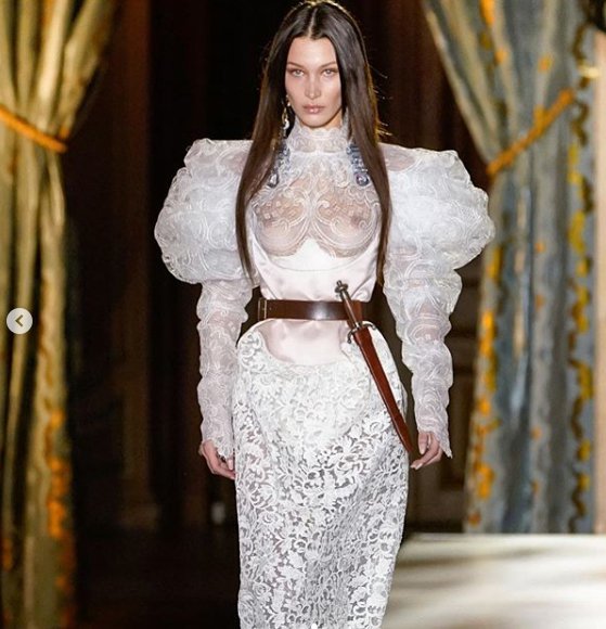 "Невеста... Спасибо за это мгновение, мое вечное уважение и любовь к вам обоим. Я так взволнована каждый сезон. Кинжал вместо цветов. Мой вид свадебного платья", - обратилась к дизайнерам образа Белла Хадид.