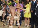 Чуть позже Уилл и Кейт прибыли с визитом в резиденцию генерал-губернатора Соломоновых островов. Несмотря на официальный статус встречи, герцогиня позволила себе надеть еще один колоритный наряд (и даже без бретелек). Впрочем, супруга генерал-губернатора тоже щеголяла в разноцветном платье.