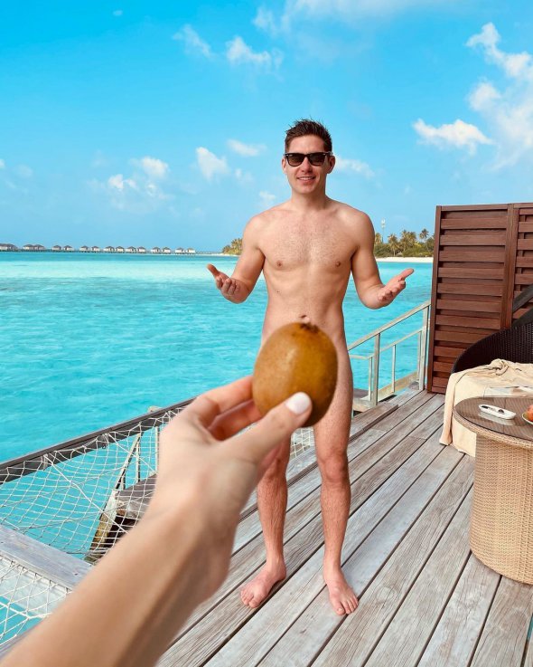 И поделился пикантным кадром с отдыха, где позировал полностью голый на террасе виллы на фоне Индийского океана. Интимное место любимая звезды прикрыла киви.