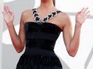 Португальская топ-модель Сара Сампайо надела черное платье, украшенное двумя бретельками из бисера, от Giorgio Armani. Волосы собрала в пучок.