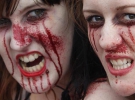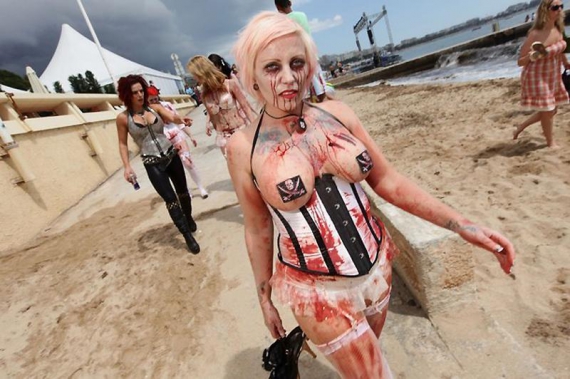 По пляжу прошлись окровавленные женщины-зомби в качестве промо-акции нового треш-фильма "Зомби-женщины Сатаны". Этот фильм был снят в прошлом году в Британии Стивом О'Брайен и Уорреном Спидом.