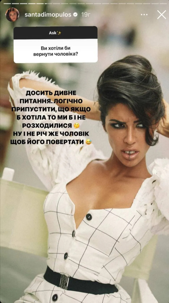 "Логично предположить, что если бы хотела, то мы бы и не расходились. Ну и не вещь же мужчина, чтобы его возвращать", - констатировала Санта.