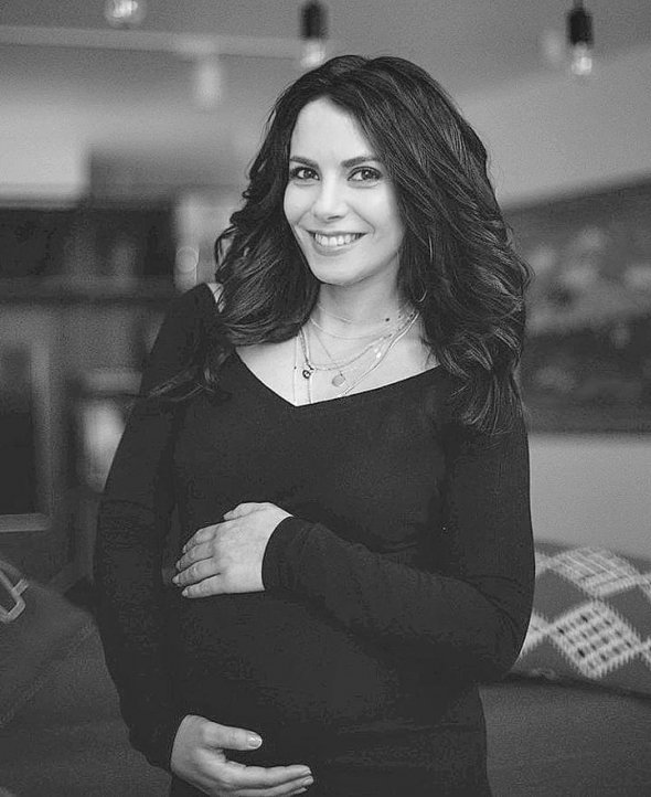 На черно-белой фотографии Каменских появилась в темной обтягивающей одеждах. Руками знаменитость поддерживала большой круглый живот.