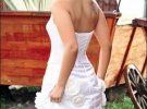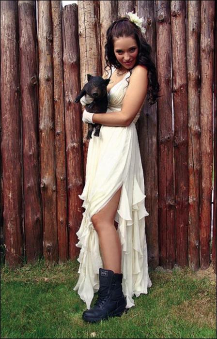 Как это ни удивительно, обычно всегда закрытая для СМИ миссис Тимошенко-Карр легко согласилась на съемку. Только попросила, чтобы наряды не были откровенно гламурными. По этой причине фотосессию решили организовать не пафосную, в стиле легкого кантри, задействовав для этого интерьеры загородного ресторана, стилизованного под ранчо. В качестве модели Женя зарекомендовала себя очень хорошо. Собранная, пунктуальная, некапризная, ну а самое главное - очень фотогеничная. Про таких говорят: их любит камера. И нужно сказать, что кринолины красавице идут не меньше, чем ее любимые кожаные куртки. Фотосессия длилась целый день. Одно платье сменяло другое. Надев очередное, Женя вдруг решила, что получится веселый кадр, если она возьмет в руки черненького поросенка, который живет при ресторане. Свинка не возражала и очень уютно устроилась в руках дочери премьера.По ходу действия Женя вспомнила свою свадьбу, которая состоялась четыре года назад, и рассказала, что платье выбирала самостоятельно, не советуясь с мамой. Пересмотрев массу нарядов, она остановилась на дорогом дизайнерском платье от Валентино.