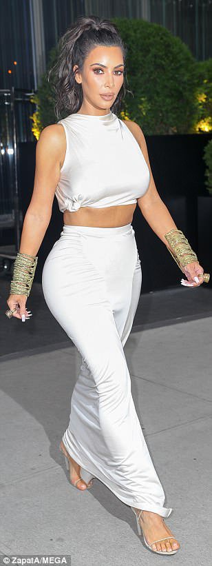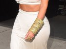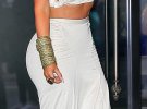37-летняя Ким в очередной раз решила похвастаться своими формами и надела на премию белый наряд от Rick Owens — юбку в пол, которая подчеркнула ее ягодицы, и белый короткий топ с открытой спиной. Здесь все внимание — на ее пресс и узкую талию. Важной деталью образа Ким стали аксессуары — надетые на обе руки золотые браслеты и крупные кольца.