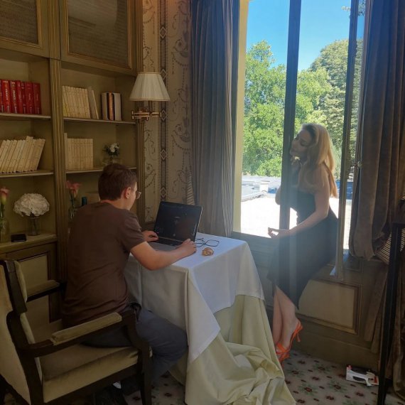Также певица опубликовала фотографию, на которой в платье позирует на подоконнике и наблюдает за сыном, сидящим за ноутбуком.