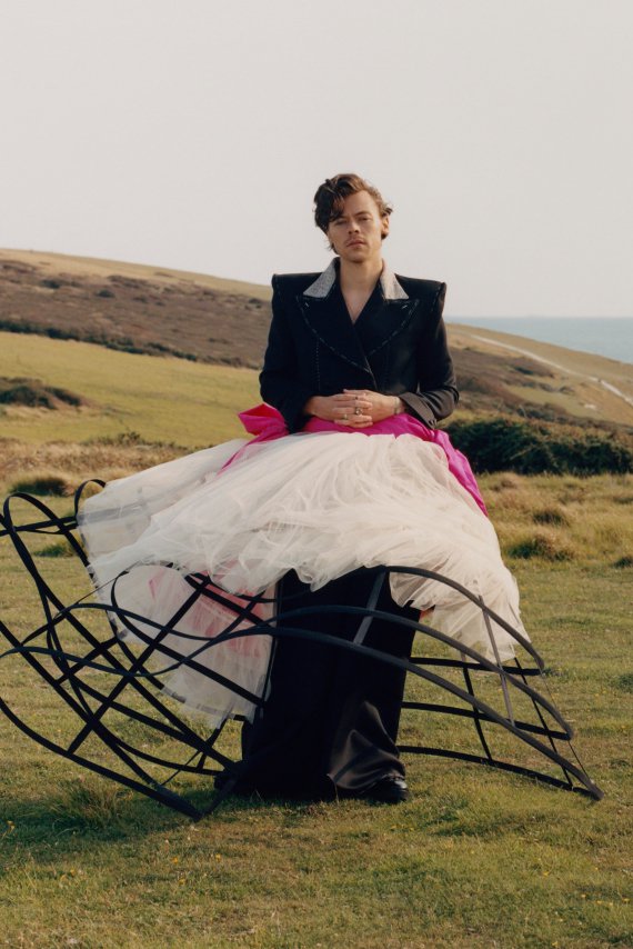 Резонансом съемки стали наряды музыканта. Стайлз предстал перед камерой в пышной юбке с поясом от Chopova Lowena, а также в платье от Gucci и клетчатой юбке от Wales Bonner.
