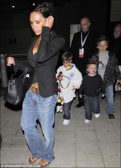 И каково же было удивление окружающих, когда они увидели Пош Спайс в шлепанцах-вьетнамках. Звезда вместе с сыновьями Бруклином, Ромео и Крусом пришла посмотреть на игру своего мужа Дэвида Бекхэма на лондонском стадионе "Уэмбли".