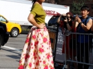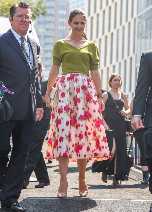 Актриса привлекала внимание своим цветущим видом, она була одета в яркие и свежие цвета. Юбка в розах и зеленый джемпер делали Кэти милой и одновременно элегантной. Похоже Кэти нашла свой ??стиль.