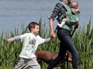 Впрочем, семейная прогулка - не повод забывать о фигуре: Жизель, не выпуская из рук дочку, с удовольствием потягивалась на ветках деревьев - энергии 32-летней звезды можно было только позавидовать.