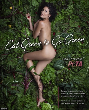 Кампания посвящена пропаганде вегетарианства, и снимок, на котором в окружении овощей и зелени возлежит 45-летняя обнаженная актриса, как бы намекает зрителю, что отказ от продуктов животного происхождения исключительно положительно сказывается на фигуре.